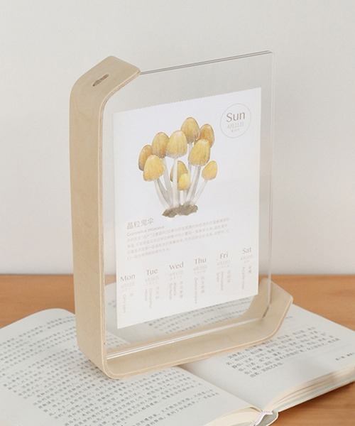 透明感のあるアクリルと、やさしい木目調フレームを組み合わせたフォトフレームスタンド。
