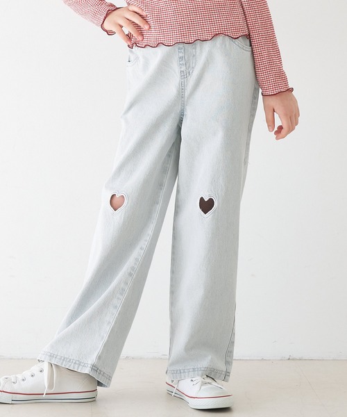 ジュニア デニム パンツ ワイド デザインデニム ハート 刺繍 カジュアル トレンド 穴あきデニム 26ss 120 130 140 150 COCA