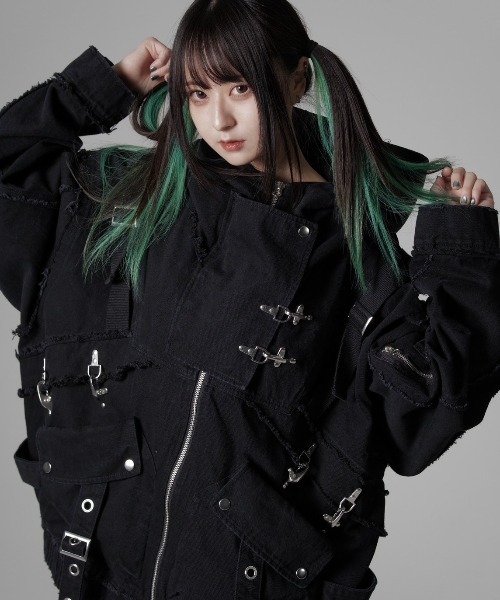 ベルトやテープ使い、モノトーンに映える金属パーツなど様々なディティールが際立つ一着です。