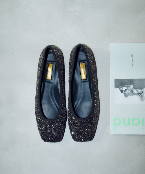 履くだけで華やかな印象になるグリッターフラットシューズ。