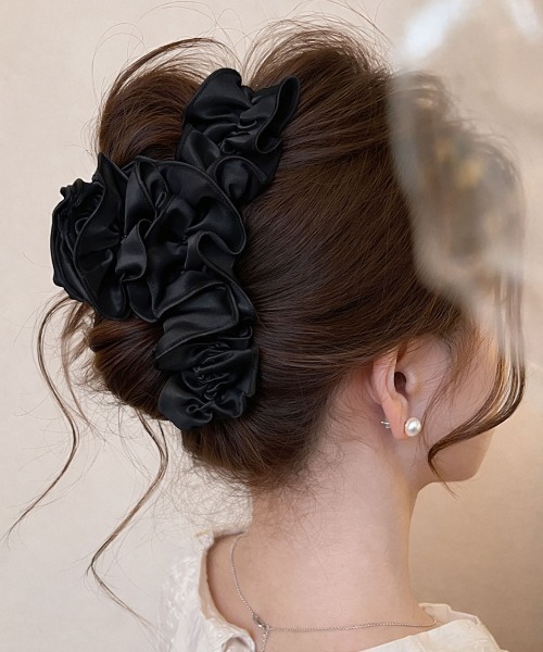 シンプルながら存在感のあるブラックカラーを基調に、リボンやフリル、シアー素材、パール調ディテールを組み合わせたバレッタ&ヘアクリップシリーズ♡
