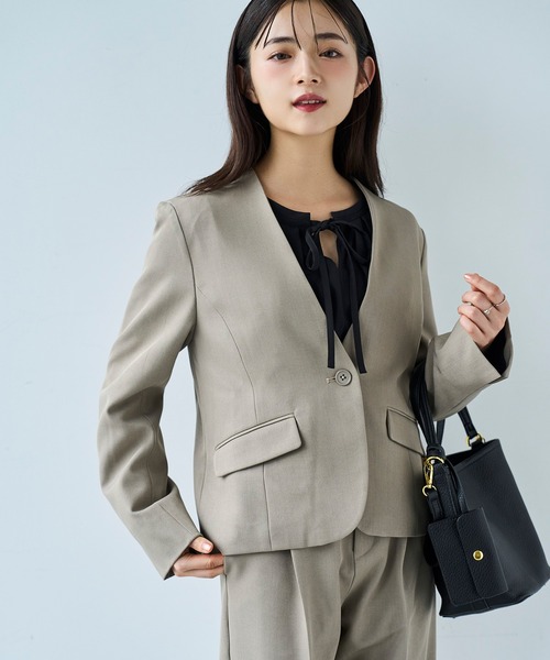 ハレの日の装いにふさわしい、凛とした印象を演出するスタイリッシュなノーカラージャケット。