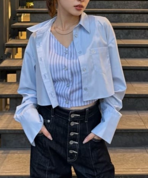 マニッシュな短丈シャツにベストを着ているようなレイヤードシャツトップス。