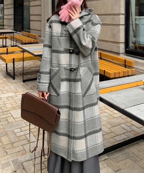 チェック柄とトグルボタンが印象的な、フード付きロングコート。