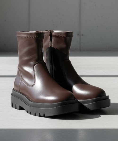 軽量で歩きやすい5cm厚底ソールが特徴のユニセックスブーツ。スクエアトゥとトラックソールの組み合わせが、足元にしっかりとした存在感をプラスします。シンプルで合わせやすいデザインで、カジュアルからストリートまで幅広く活躍。