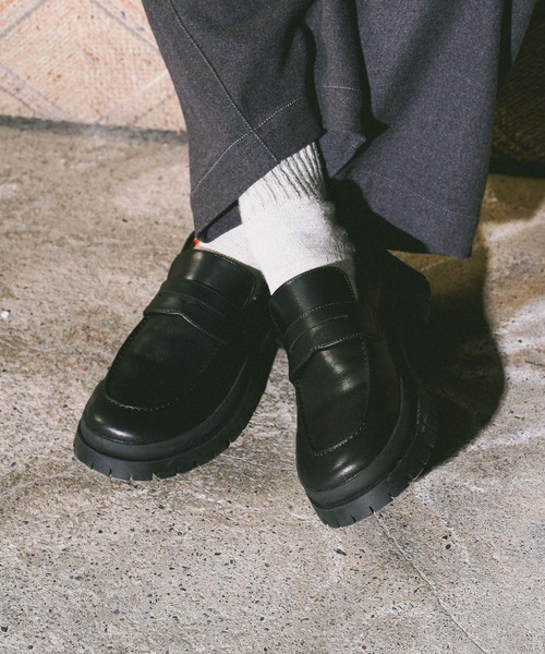 クラシックなコインローファーに厚底ソールを掛け合わせたトレンド感のあるフェイクレザーシューズ。