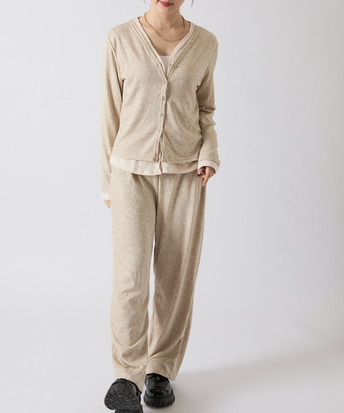 カーディガン部分は深めのVネックでデコルテをきれいに見せつつ、フェイクレイヤードがアクセントになり、顔まわりに立体感をプラスします。