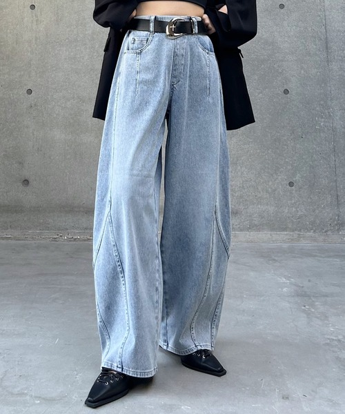 \柔らかく伸縮性のあるカットソー生地を使用したデニム見えのカーブパンツ/