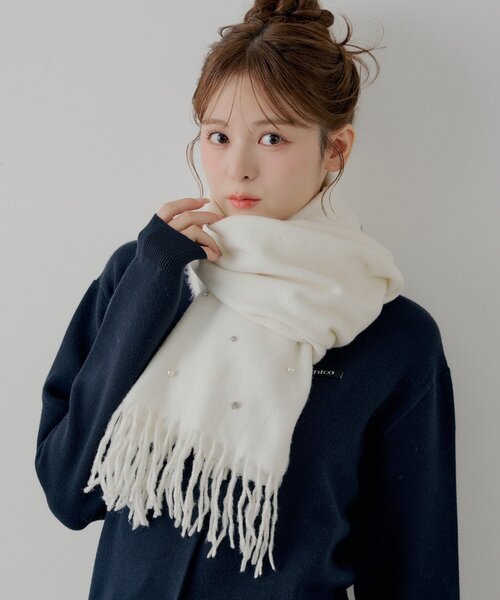ビジューが目を惹くストール登場!?商品ポイント・シンプルな装いにプラスするだけで、一気に華やかさを添えるビジュー付きストール。