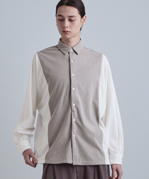 身頃と袖が一体となったドルマンスリーブと、大胆なショルダーラインの切替配色が目を惹くデザインシャツ。