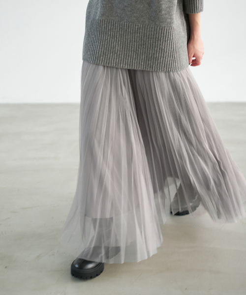表情豊かなランダムプリーツと繊細なチュールが重なり合う、2枚仕立てのマキシ丈スカートです。