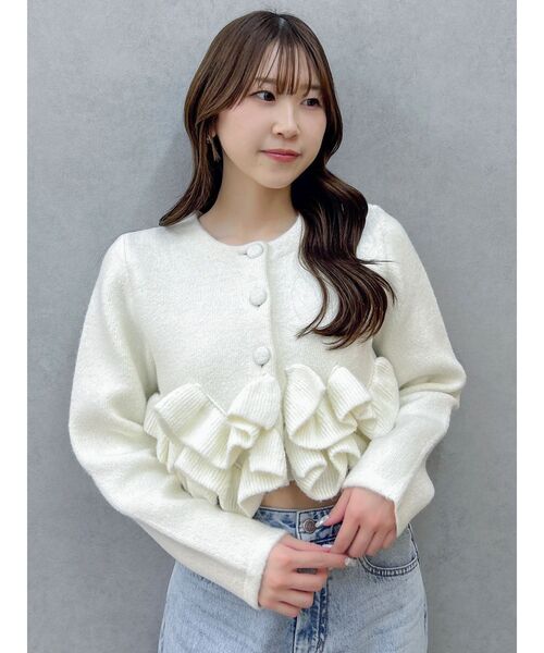 裾にあしらった構築的なフリルデザインが目を惹く着映えニットジャケット。