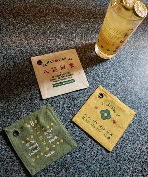 タイの大人気プリン屋さんとの初コラボレーション色によってデザインが異なる、3色セットのコースター。