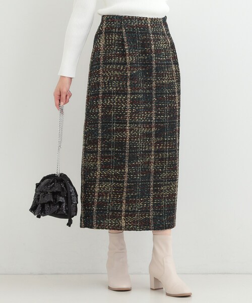 表情のあるミックスツイード素材が、コーデに季節感をプラスしてくれるナロースカート。