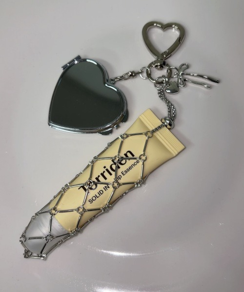 チェーン素材のリップケースとハート型のミラー付きがキュートなバッグチャーム。