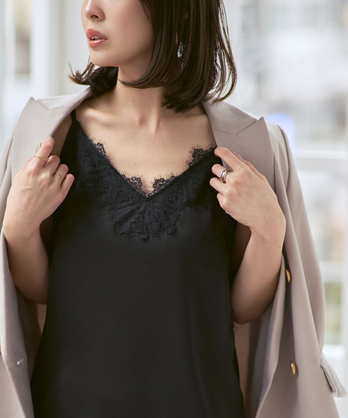 繊細なリバーレースを施したサテンキャミソール。
