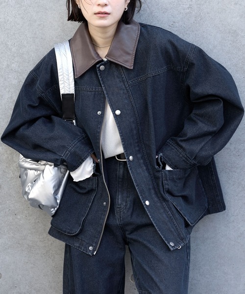 ・配色のレザー調襟がほどよいアクセント