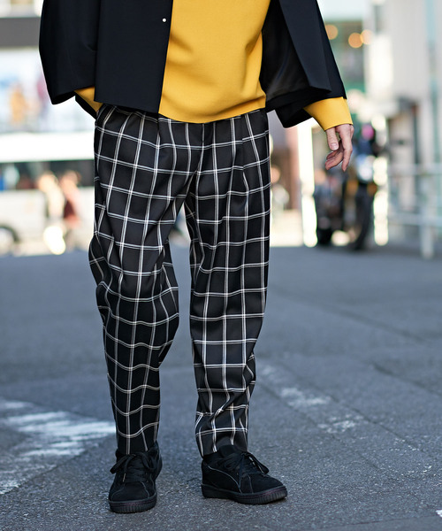キーワード:パンツ メンズ ウエストゴム クロップド チェック テーパード ハイウエスト ワイドパンツ