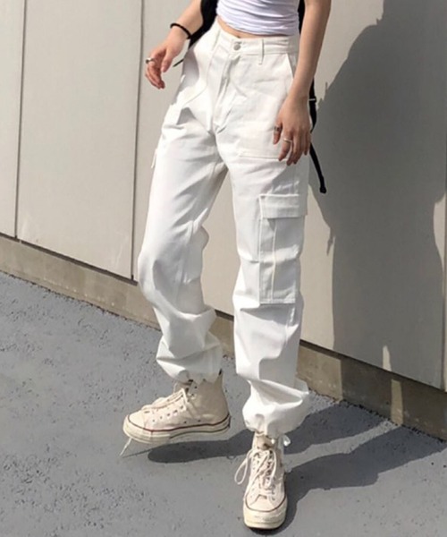 キーワード:カーゴパンツ レディース ウエストゴム ストレート ハイウエスト フルレングス ワイドパンツ 無地