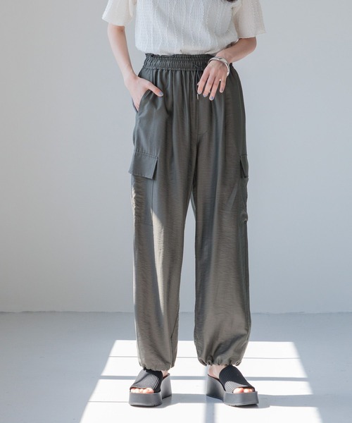 キーワード:カーゴパンツ レディース ウエストゴム ハイウエスト フルレングス ワイドパンツ 無地