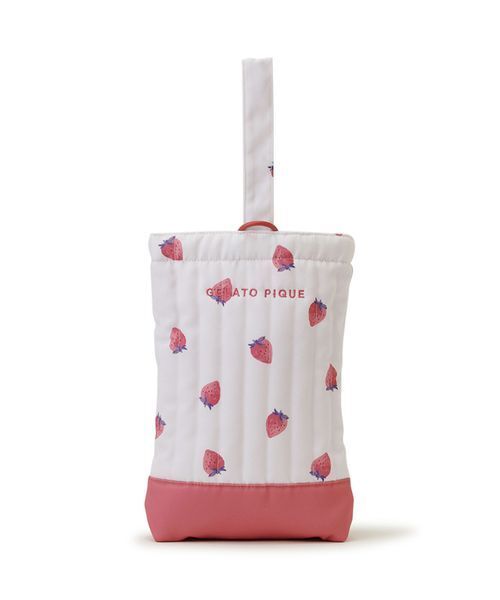 入園・入学式や新学年を迎えるKIDSのための、gelato piqueらしいキュートなバッグ&収納シリーズが装い新たに新登場。ストライプのキルト生地にカラフルな柄プリントを配した、裏地付きのシューズバッグです。上履きや運動靴などをすっきりと収納。ハンドルの根元に付いたリングが中身の飛び出しを防ぎ、底面は無地の生地で汚れが気になりにくい仕様です。撥水機能をプラスした生地を使用し、より使いやすさが向上しました。ワンポイントでブランドロゴの刺繍入り。色はいちご柄のオフホワイト、ベア柄のベージュ、リボン柄のピンク、ダイナソー柄のブルーの4色展開です。同シリーズのバッグや巾着と組み合わせてお楽しみください。