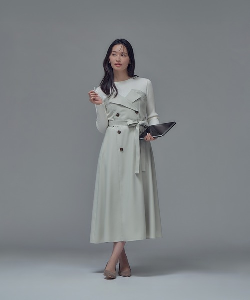 トレンチディテールのジャンスカをドッキングした、一枚でスタイリングが決まるワンピース。ボタン位置で脚長効果を期待でき、ベルトマークでウエストがすっきりと見えます。後ろウエストはゴムディテールでフィットし、体に沿いながら着ていただけます。
