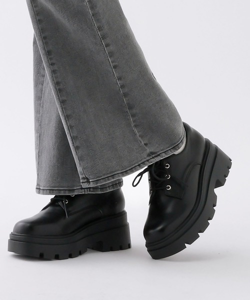 ミニ丈のボトムスに合わせて足元に重心を置く、