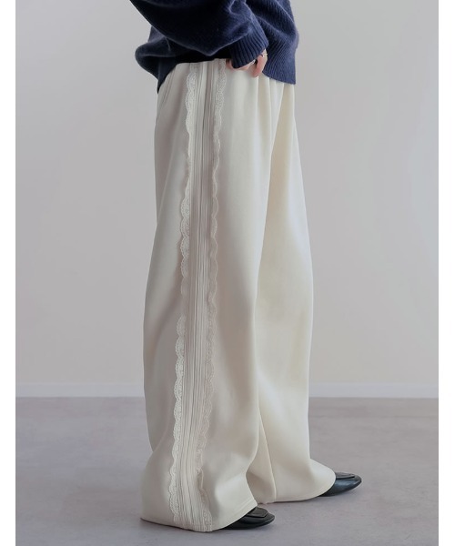 スポーティなサイドラインパンツを、繊細なレースでレディにアップデートした裏起毛スウェットパンツ。