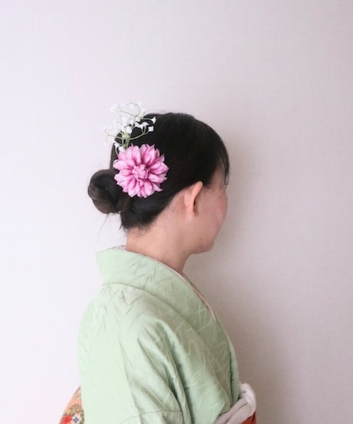 また、ダリアは「優雅さ」を、かすみ草は「清らかさ」を象徴しています。この和装ヘアアクセサリーを身に着けることで、心温まるメッセージを表現できます。特別なお祝いの場だけでなく、普段のお着物スタイルにも美しいアクセントを加えます。