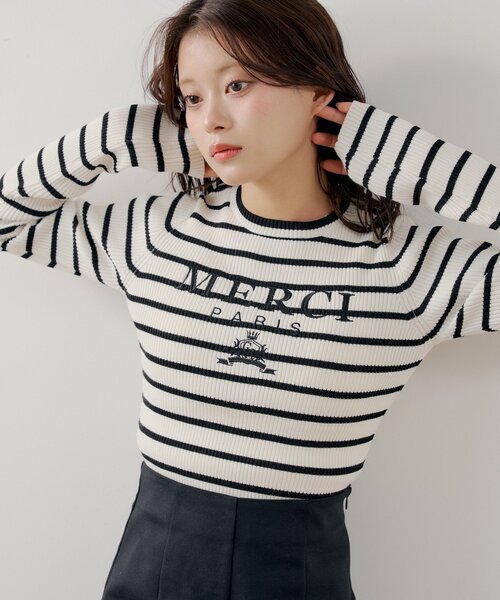 カジュアルながらも大人可愛い、ロゴ刺繍ボーダーニット登場!※画像はサンプルで撮影したため、実際とは異なります。