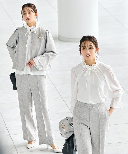 【3点set】ストレッチツイード・ゆる洒落ジャケット&セミフレアパンツセミシアーブラウス付き