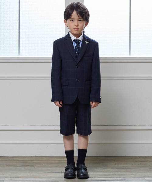 クラシカルなチェックのジャケットとパンツは上品な華やかさを演出。目を引くドット柄のネクタイはワンタッチでつけれる簡単仕様。襟についた飛行機モチーフのピンパッジがさりげなく彩りを加えます。