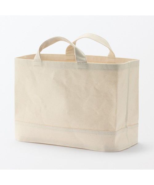 古くは船の帆にも使われてきた丈夫な帆布素材を使ったスリムな持ち手付き収納です。内側と底面は、汚れが付きにくく水拭きもできる、EVAコート加工を施しています。丈夫な綿帆布を使用しているので、アイロン用品や洗濯用品、読みかけの本とストールをまとめるなど、おうちの中で移動しながら使う用途におすすめです。