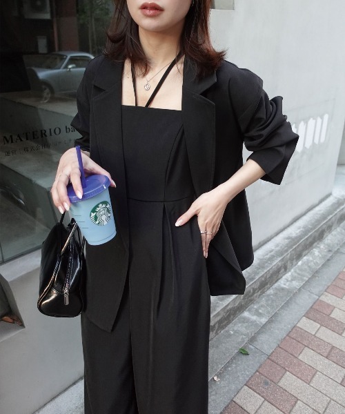 さらっと羽織れるテーラードジャケットと、女性らしいラインが魅力のキャミサロペットをセットにした、洗練感のある一着。