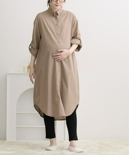 シャツワンピースとカットソーパンツのマタニティパジャマ上下セットです。