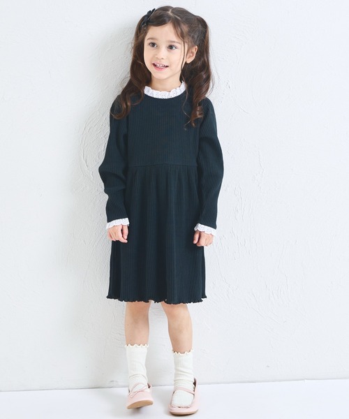 シンプルな無地デザインのワンピースに、襟元と袖部分に施されたレースフリルがよく映える1枚です。