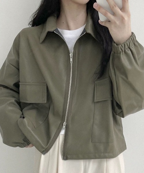 レザー調 / フェイクレザー / 合皮ジャケット / ショート丈アウター / ミリタリー風