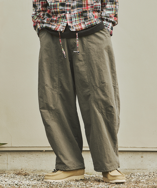 ゆったりとしたワタリから裾にかけて自然に落ちる立体的なシルエットが特徴で、リラックス感がありながらも野暮ったく見えないバランスに仕上げています。膝周りには切り替えを入れることで、動きやすさと立体感を両立。腰、裾にはドローコードを配し、シルエットの調整も可能です。