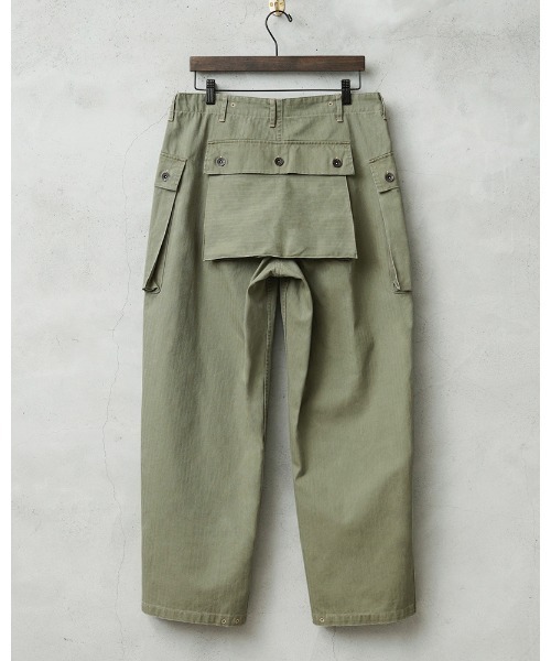 USMCのヘリンボーンツイルの中でも、最も希少なレアピースとしてヴィンテージ市場でも非常に価値の高いモンキーパンツを再現しました。両サイドの大型のカーゴポケットとヒップの大型のフラップ付きのポケットが特徴です。