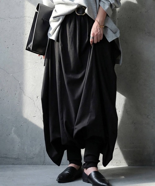 スカートのようにも見える大胆なドレープが魅力のサルエルパンツです。