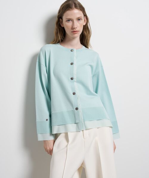 裾や袖口には切りっぱなしの生地を重ねて、軽さを出しながらレイヤード風のデザインに。モードな印象のワイドスリーブは、袖口のループとボタンで太さ調整が可能です。前立て部分も生地とニットのレイヤード風に見せており、縫い込まず、浮かせた仕様で軽さを表現しています。