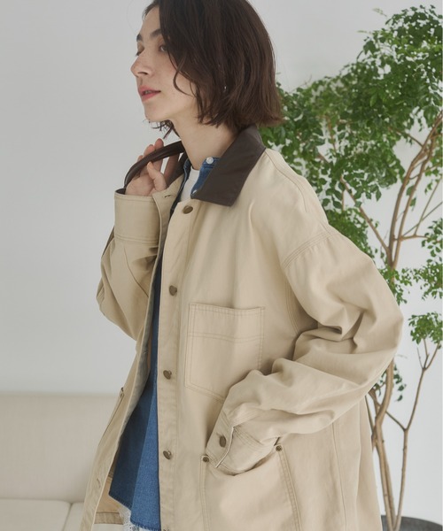 フェイクレザーの襟と袖口がアクセントになるアイテム。