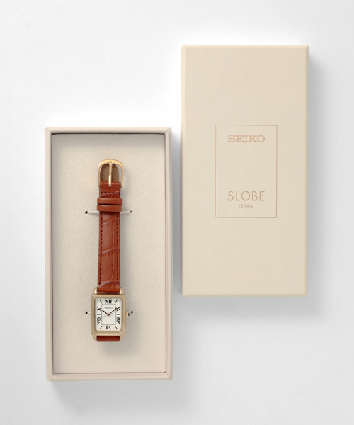 今年もSLOBE IENAとSEIKOのコラボアイテムが登場しました!抜け感のある飛びローマ数字のインデックスは、エレガントさと軽やかさを兼ね備え、毎日どんな服装にも合わせやすいデザインです。レザーバンドは明るいキャメルで、春先の明るい装いにもぴったりのカラーです。りゅうずにはオニキス入りで秒針には差し色に青を忍ばせています。裏ぶたにはオリジナルの「SLOBE IENA」ロゴ入り。