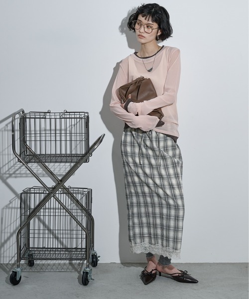 カジュアルなチェックのボディに映える、裾のレース切替がポイント。
