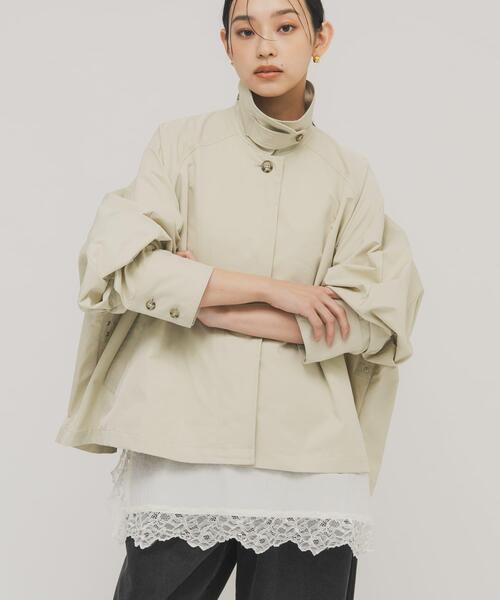 【ワードローブに加えたいマント風アウター】ステンカラーデザインがポイントのコートをマント風にアレンジした1着。背中に大きくとったタックでボリューム感を演出しました。衿のタブを留めるとスタンドネックにもなり、袖は釦が付いており留めるとコクーンシルエットにも変化します。シンプルに見えながらもこだわりが詰まったアイテムに仕上げており、今年の定番アウターとしておすすめです。