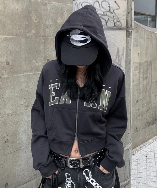 カレッジロゴ風の「EARN」ロゴに迷彩柄を落とし込み、さらにスタッズをあしらった、こだわり満載のショート丈パーカー。
