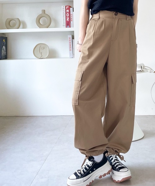 キーワード:カーゴパンツ レディース ウエストゴム ストレート ハイウエスト フルレングス ワイドパンツ 無地