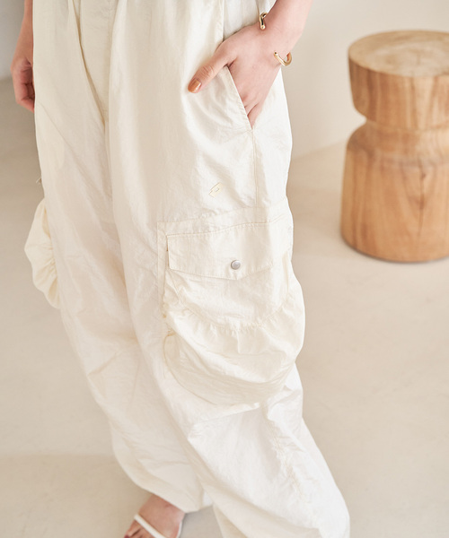 キーワード:カーゴパンツ レディース ウエストゴム ハイウエスト フルレングス ワイドパンツ 無地