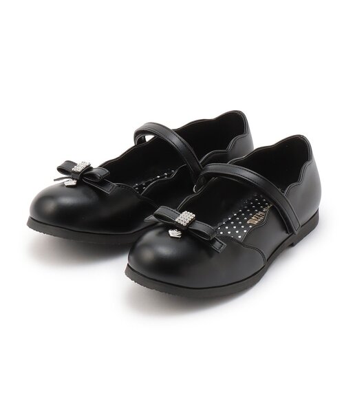 リボンモチーフの中心にラインストーンを並べてさりげない輝きをプラスしたバレエシューズです。