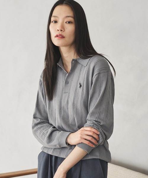 縦ラインが際立つ針抜き編みを採用した、上品な印象のポロニット。